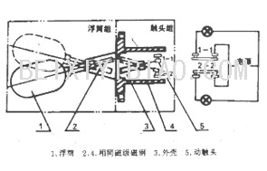 当被测液位升高至上切换点时,浮球1随之上升,使其端部的磁钢2向下摆动,通过磁力作用,推斥安装在外壳3内相同磁极的磁钢4上、下摆动,其另一端的动触点5便在静触点2-2间连通。当液位下降至下切点时,情况正好相反,静触点1-1被接通。上切换点至下切换点之间的区域称为切换差区域。
