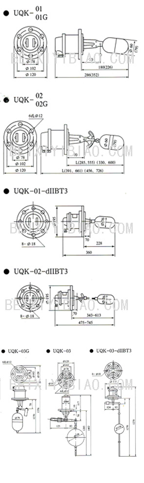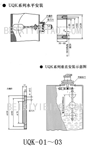 UQK-01、02安装法兰通径不得小于Φ80,以免浮球进不了容器造成无法安装的后果。        单位:mm