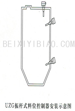 ●UZG系列振杆式料位控制器可以顶部垂直安装,也可以侧面安装,侧面安装时控制器应向下倾斜70度,以避免料物堆集在控制器上造成误信号。