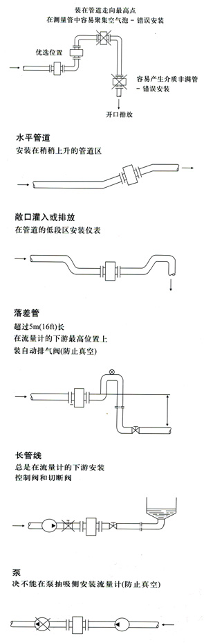 为了保证流量计满管和避免夹附气体等而引起的测量误差以及有真空引起的对PTFE衬里的损害,请参见图11的安装位置。