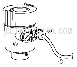 ①电源线和信号线;②内部接地端子;③显示调节接线端子